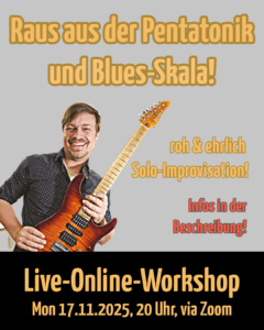 - Online-Live-Workshop 17.11.2025: How to solo the easy way – blues style!von m.barthDu spielst immer wieder dieselben Pentatonik-Licks?Hängst irgendwie in der Standard-Form fest?Alle fünf Skalen schon probiert – aber es klingt trotzdem nicht nach Musik, nach einem ehrlichen Solo mit Drive und Gefühl? Zeit, raus aus dem… Online-Live-Workshop 17.11.2025: How to solo the easy way – blues style! weiterlesen